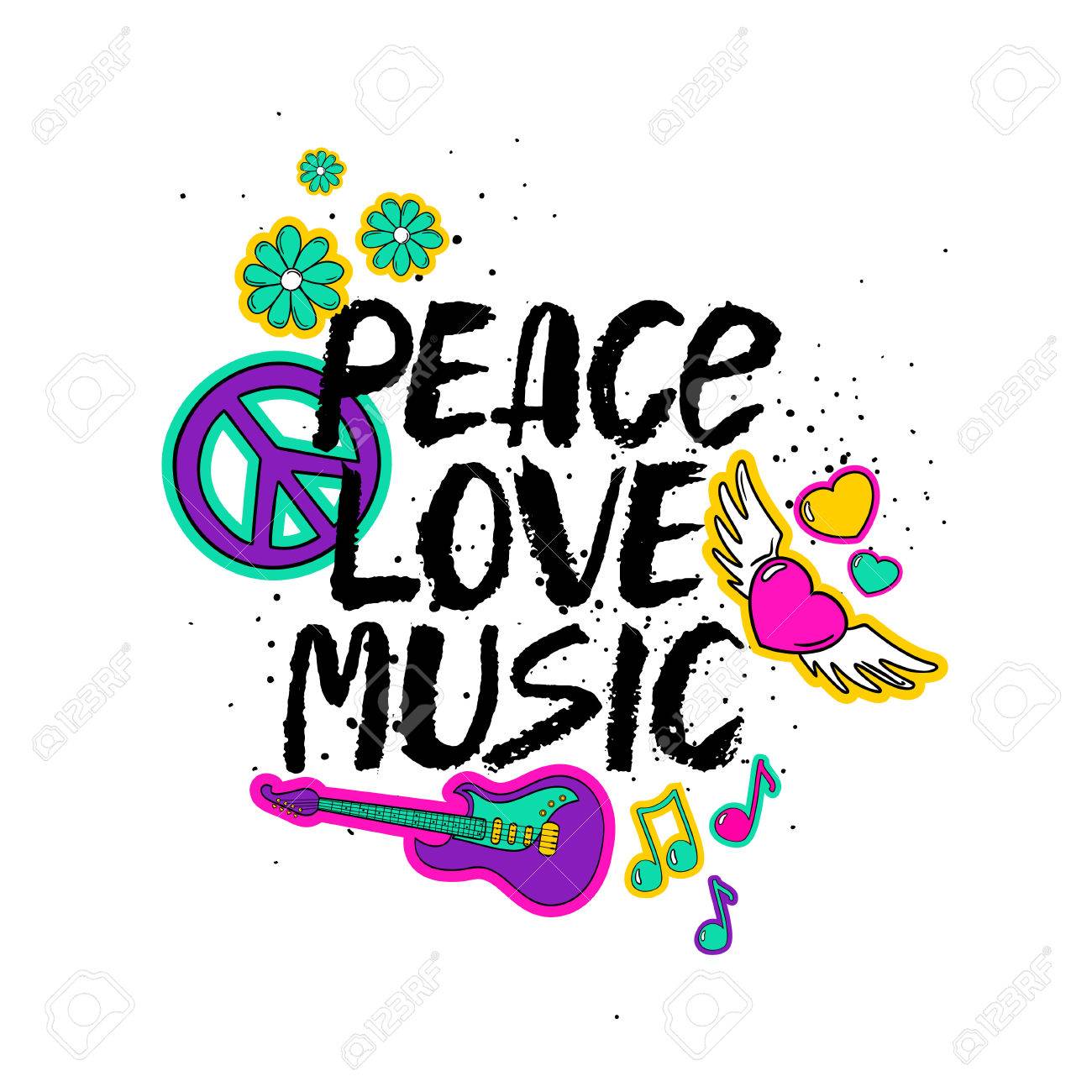 Peace Love Music Inspirational Hand Drawn Brush Ink Lettering With Colorful Cartoon Stickers Royalty Free Cliparts Vectors And Stock Illustration Image 78788052